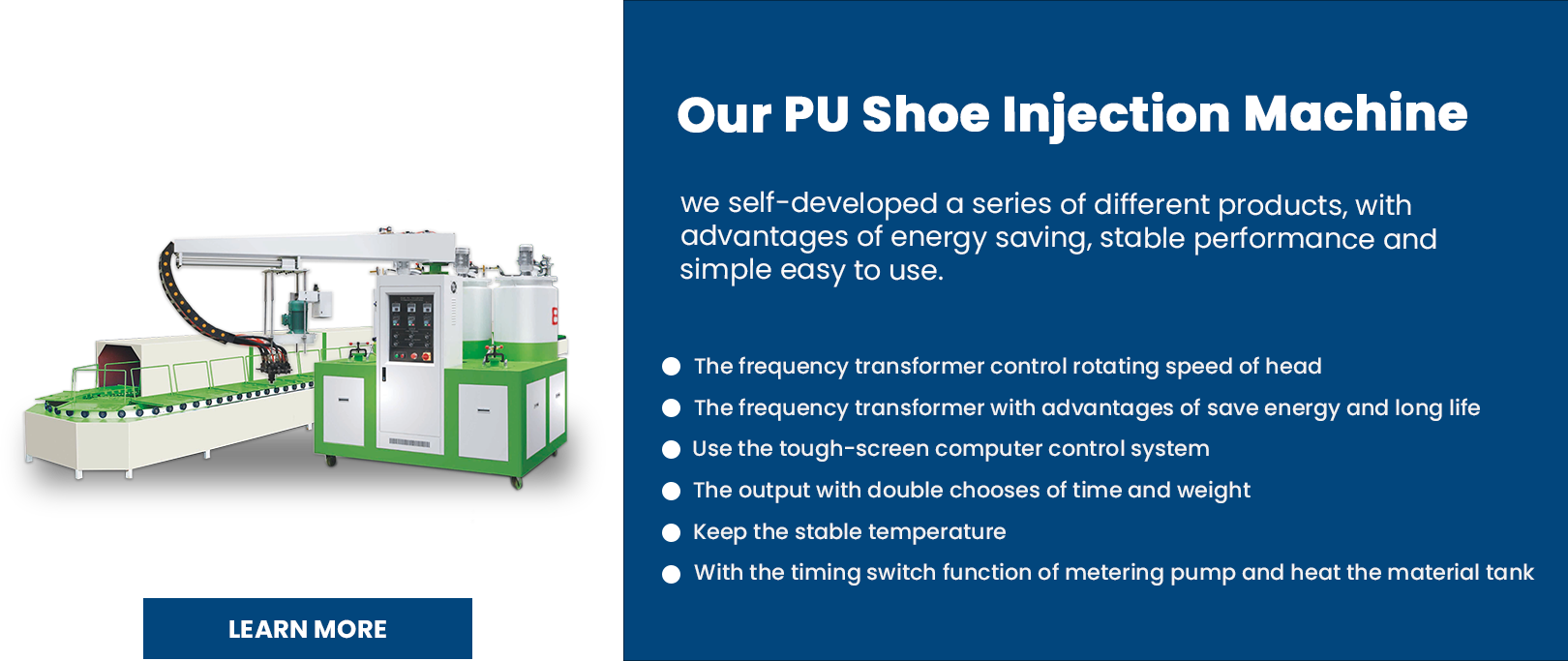 We Self-developed a series of PU shoe pouring machine of JG-801, JG-803, JG-805, JG-806, JG-807, JG-808 and JG-901 Ring Production Line , JG-902 Elevated Heating Molding Line, JG-903 Conveyor Line and so on.